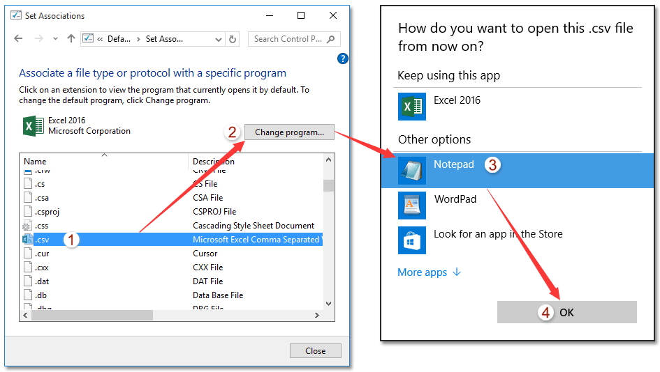 3. В диалоговом окне «Установить связи» щелкните, чтобы выбрать расширение указанного типа файла (. Csv в моем примере), а затем щелкните Изменить программу кнопка. Смотрите скриншот: