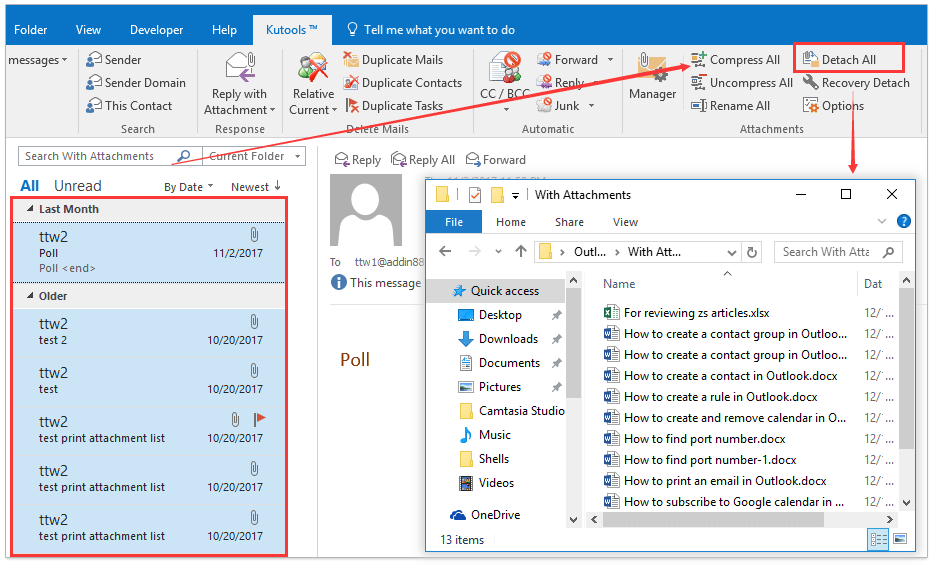 Обычно мы можем сохранить вложения из одного письма, активировав Инструменты для вложения и применение Сохранить все вложения функция в Outlook. Но что, если сохранять вложения из нескольких писем или из всей почтовой папки в Outlook? Попробуйте Kutools for Outlook Отсоединить все (вложения).