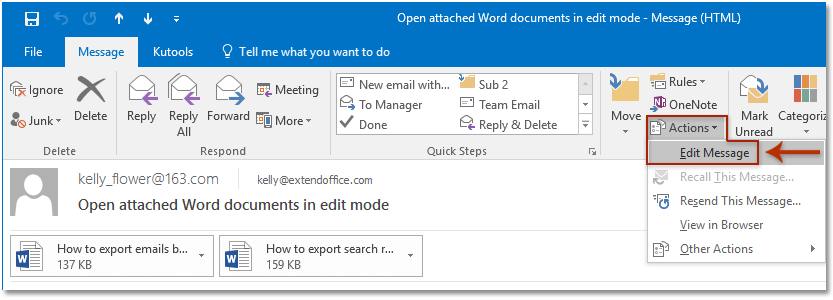 6. Теперь письмо откроется в окне сообщений. Пожалуйста, нажмите Сообщение > Действия > Редактировать сообщение. Смотрите скриншот: