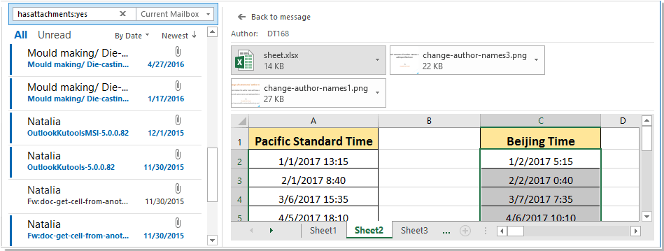 Например, вы получили сообщение электронной почты с вложением книги в Outlook. Обычно вы можете предварительно просмотреть вложение книги прямо в области чтения, не загружая ее. Щелкните вложение под заголовком сообщения, и вы увидите вложение книги, как показано на следующем снимке экрана. Вы даже можете переключаться между листами в прикрепленной книге.