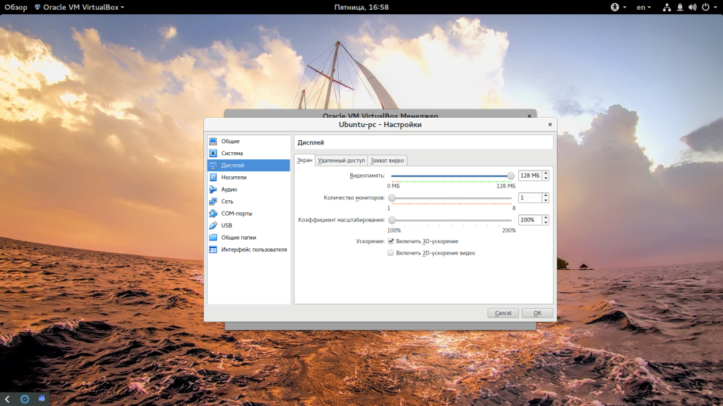 В Дисплей увеличить видеопамять и Включить 3D-ускорение (это можно отключить, если виртуальная машина выйдет из строя)