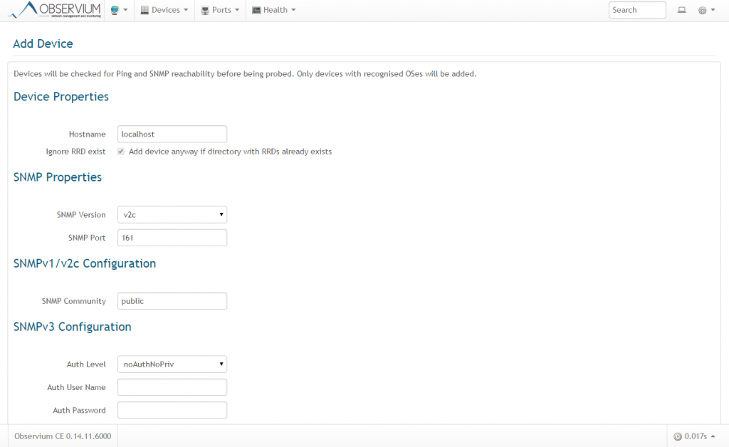 Теперь добавляем новое устройство в Observium через web интерфейс. Для этого выбираем Devices -> Add Device. Добавляем наш сервер: