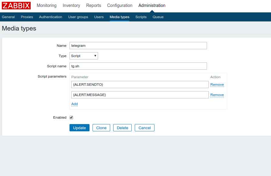 #!/bin/bash TOKEN=’179320554:AAHI9AeBkptHgMIh5pVs31CRzGHV_9sG8bs’ which curl &>/dev/null if ; then echo ‘FAIL: curl not found.’ && exit 1 ; fi if ; then echo ‘FAIL: Params not defined.’ && echo ‘Usage: zabbix-to-telegram-notify.sh TelegramID Subject Message’ && exit 1 ; fi CHAT_ID=”$1″ SUBJECT=”$2″ MESSAGE=”$3″ curl -s –header ‘Content-Type: application/json’ –request ‘POST’ –data “{“chat_id”:”${CHAT_ID}”,”text”:”${SUBJECT} ${MESSAGE}”}” “https://api.telegram.org/bot${TOKEN}/sendMessage” | grep -q ‘”ok”:false,’ if ; then exit 1 ; fiЕсли используется прокси, то нужно добавить соответствующие параметры для curl.Скрипт нужно положить в каталог, который указан в параметре “AlertScriptsPath” в конфиге zabbix сервера:# grep -i AlertScriptsPath /etc/zabbix/zabbix_server.conf | grep -vE ‘^#’ AlertScriptsPath=/etc/zabbix/alertscriptsИ сделать его исполняемым:chmod +x /etc/zabbix/alertscripts/zabbix-to-telegram-notify.shШаг 4. Теперь нужно настроить сам zabbix, чтобы он мог пользоваться скриптом. Для начала нужно создать новый способ оповещений. Я буду рассматривать для zabbix 3+, т.к. использую его. В 2.2-2.4 разница не большая.