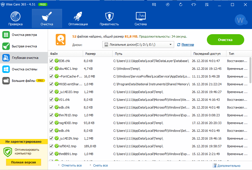 Следующий комплект инструментов со схожими возможностями Wise Care 365 знакомое название не правда ли данный набор уже включает в себя отдельно распространяемые утилиты Disc Cleaner и Registry Cleaner Free функционал которых дополнен опцией безвозвратного удаления файлов, менеджером программ и рядом инструментов для просмотра сведений о системе. Cамое весомое ограничение бесплатной версии приложения это запрет на создание резервных копий. Cтоимость полной версии почти 40 долларов за 1 год использования.