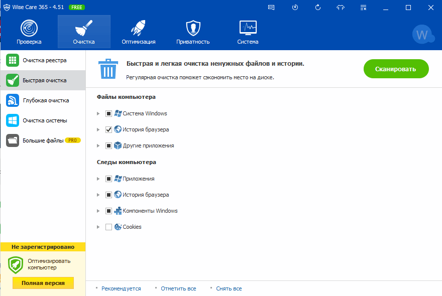 Wise Care 365 — представляет собой внушительный пакет утилит для оптимизации компьютера, большинство из которых доступны бесплатно (приложение выпускается в двух версиях — free и premium, в версии free некоторые пункты заблокированы). Как и в CCleaner, Wise Care 365 сканирует систему на наличие мусора, ошибок, неправильных (с точки зрения разработчиков) настроек и дает возможность это исправить — как по отдельности, так и «оптом».