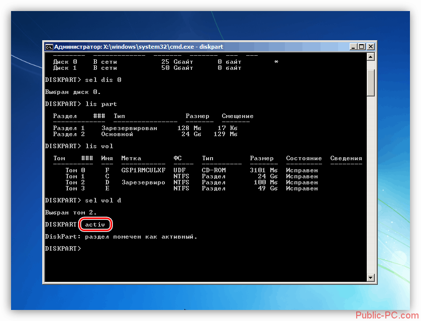 В открывшемся окне вводим команду list disk — Вам отобразится жестких список дисков. Если диск один — соответственно в списке будет только disk0 . Вводим команду select disk 0. Жесткий диск выбрали. Теперь надо выбрать раздел. Вводим команду list partition — отобразиться список разделов. Выбираем системный раздел — он как правило первый — select partition 1. Затем надо ввести команду active. Этим Вы снова сделаете нужный раздел активным.