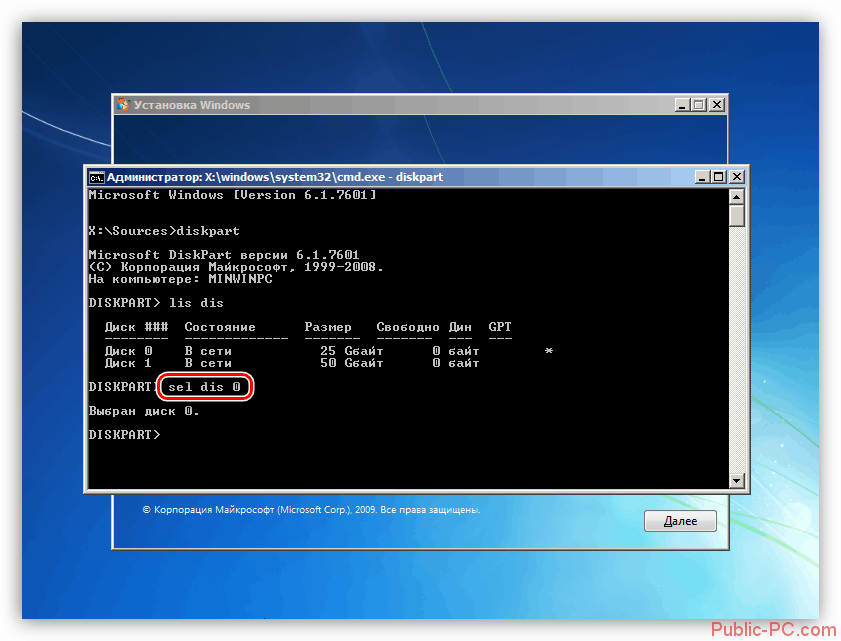 - Укажите команду sel dis 0, где 0 — это номер диска. Это необходимо для того чтобы выбрать носитель.