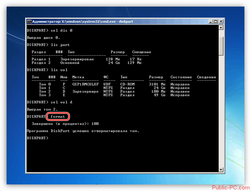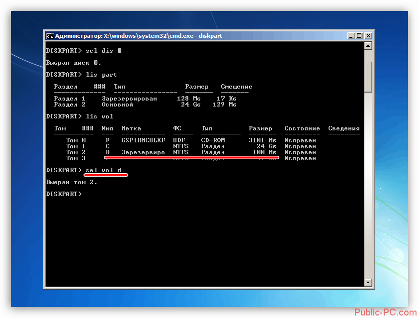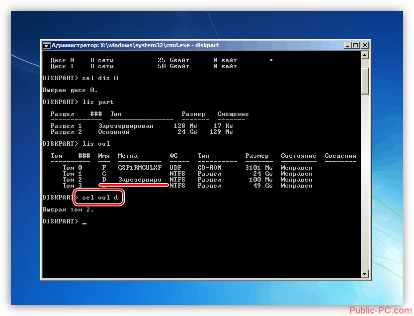 - Укажите команду sel vol d, где «d» — это том с раздела «Зарезервировано системой».