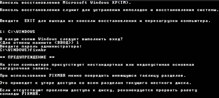 Решение в этом случае такое. Ищем загрузочный диск с системой Windows, вставляем его в привод и загружаемся с него. В случае Windows XP — при появлении надписи Установка Windows нажимаем кнопку R. Откроется консоль восстановления Windows . В ней нажимаем цифру, соответствующую Вашему загрузочному разделу и вводим команду fixboot а затем — fixmbr: