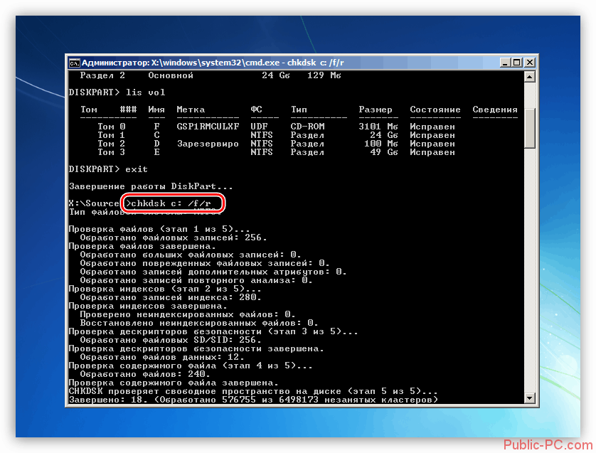 Чтобы выполнить проверку диска, впишите chkdsk c: /f/r. Буква «c» — это раздел в «lis vol». Остальные значения, указанные после этой буквы – это настройки, с помощью которых вы можете исправить некоторые поврежденные сектора.