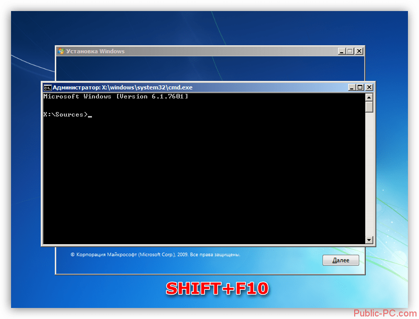- Нажмите сочетание клавиш SHIFT+F10, для того чтобы открыть консоль администратора.