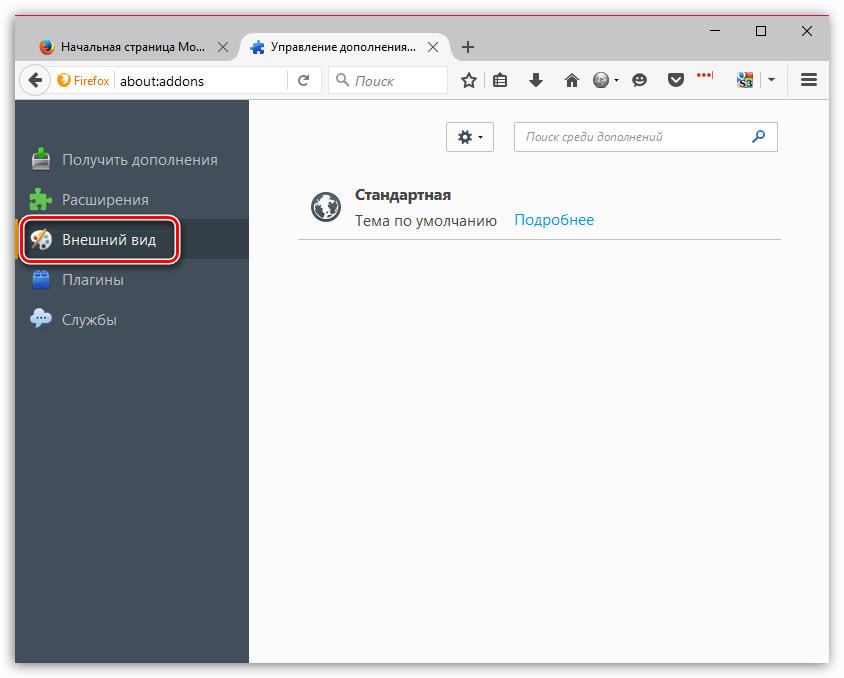 Следом перейдите ко вкладке «Внешний вид» и удалите все сторонние темы, оставив и применив для Firefox стандартную.