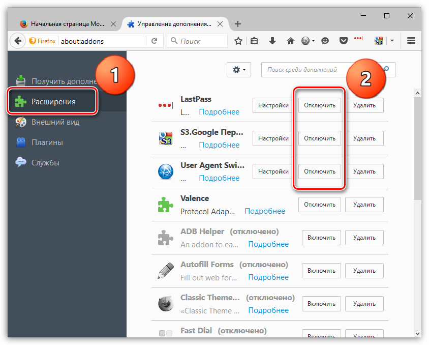 Прежде всего, откройте меню браузера и перейдите к разделу «Дополнения». В левой области окна, открыв вкладку «Расширения», отключите максимальное количество расширений, установленных для вашего браузера.