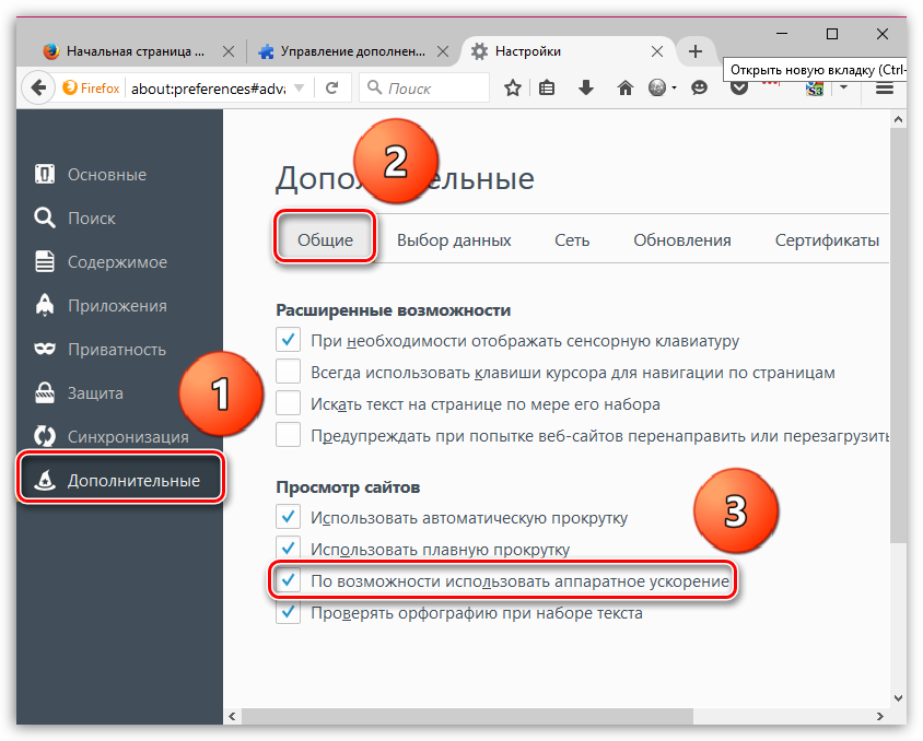 В левой области окна перейдите ко вкладке «Дополнительные», а в верхней откройте подвкладку «Общие». В данном окне вам потребуется снять галочку с пункта «По возможности использовать аппаратное ускорение».