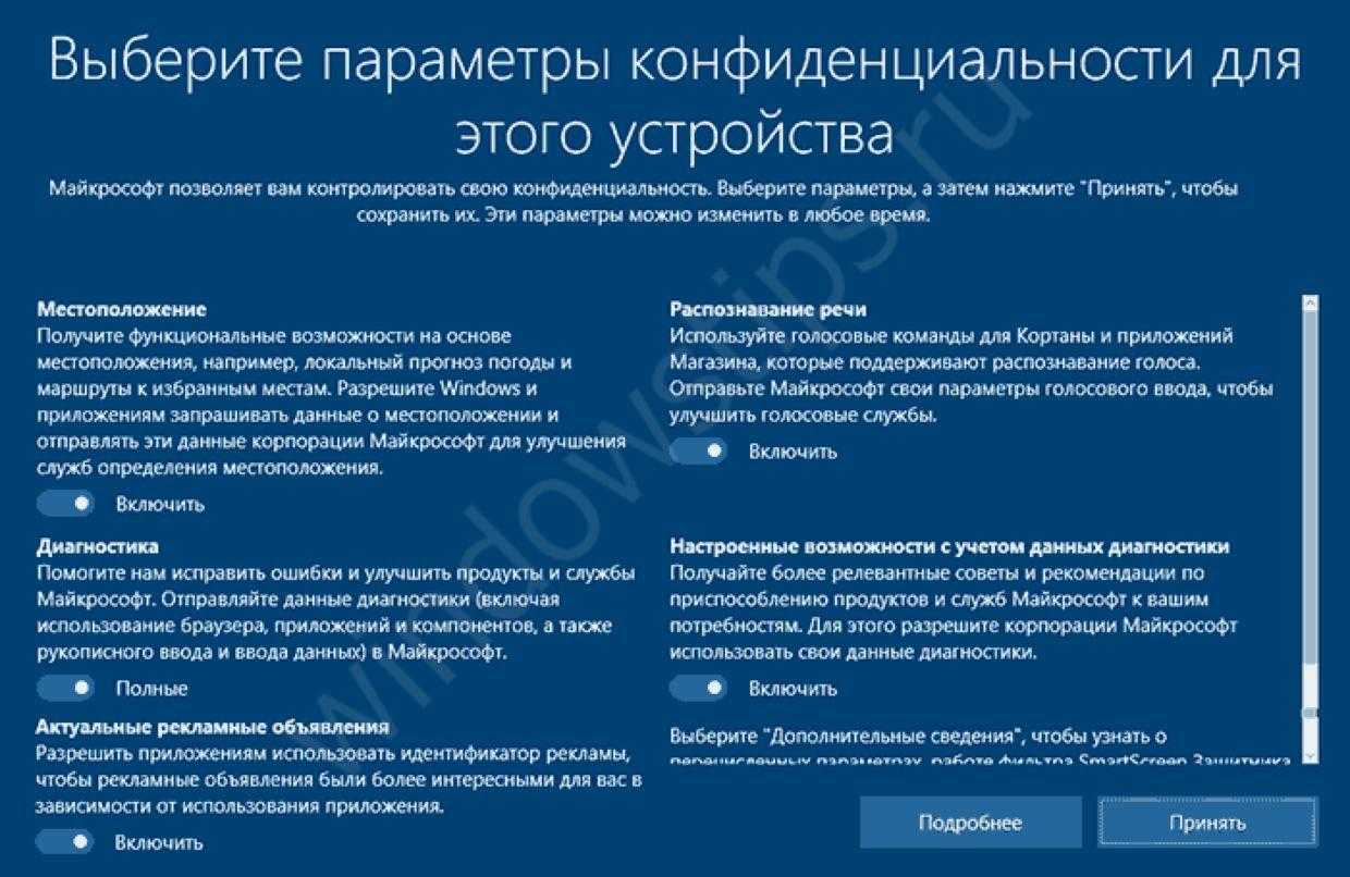Во время установки, вам будет предложено выбрать параметры конфиденциальности устройства. Поэтому, для отключения слежения в Windows 10, с самого начала, следует выключить все предлагаемые параметры.
