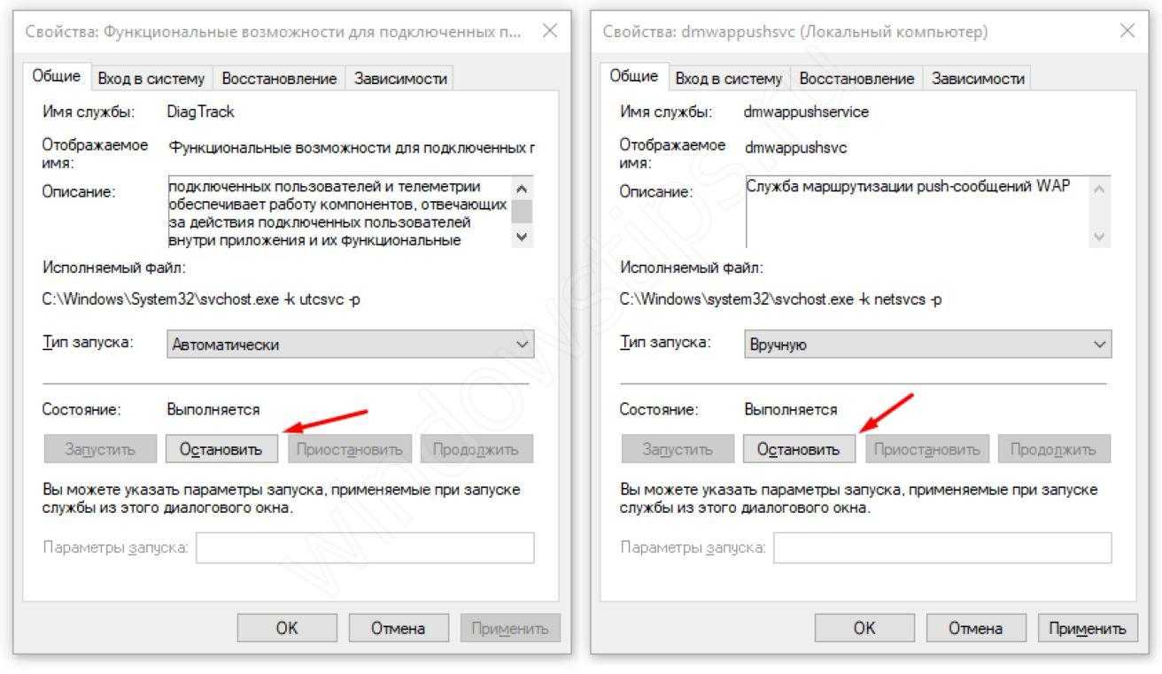 Затем, найдите указанные выше службы и откройте их свойства. Вам потребуется остановить службы, а после этого поменять «Тип запуска» на Отключена.