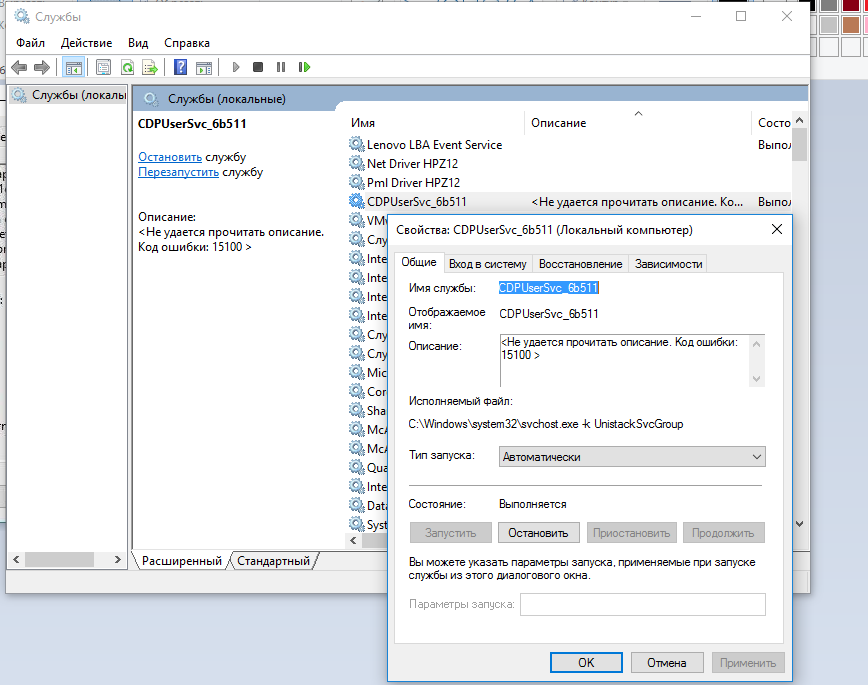 При просмотре свойств службы CDPUserSvc на вкладке Общие обнаруживаем ошибку: «Не удается прочитать описание. Код ошибки 15100». Поскольку эта служба работает в фоновом режиме, пользователи пытались ее отключить в Диспетчере задач, но при попытке сделать это сталкиваются с ошибкой «Неверный параметр».
