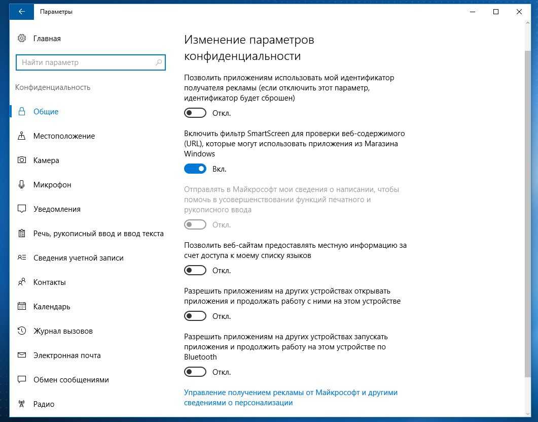 - Общие – отслеживание рекламы, запуска приложений в меню Пуск, а также рекомендация приложений и разрешение на использование языка системы веб-сайтами