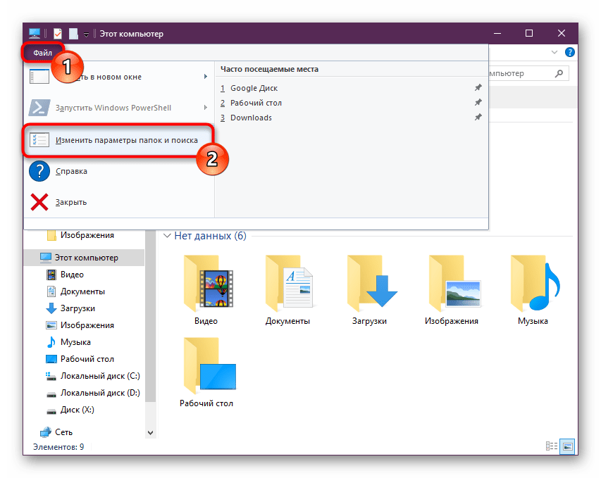 Перейдите в любую папку, нажмите на вкладку «Вид» в меню сверху, и из списка элементов выберите «Параметры». Аналогичный результат будет достигнут, если вызвать меню «Файл», а оттуда — «Изменить параметры папок и поиска».