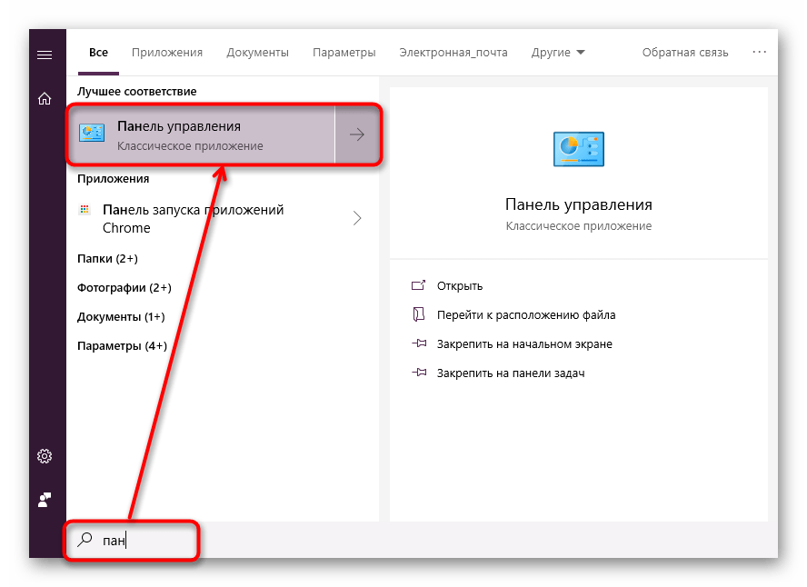 - Используя этот способ, можно облегчить дальнейший запуск ПУ. После отображения результатов в поиске, если нажать правой кнопкой мыши на нужный вариант, откроется небольшой список вариантов. Среди них будет «Закрепить на панели задач». После выбора этого варианта ПУ будет закреплена в панели задач, что позволит быстро к ней переходить.
