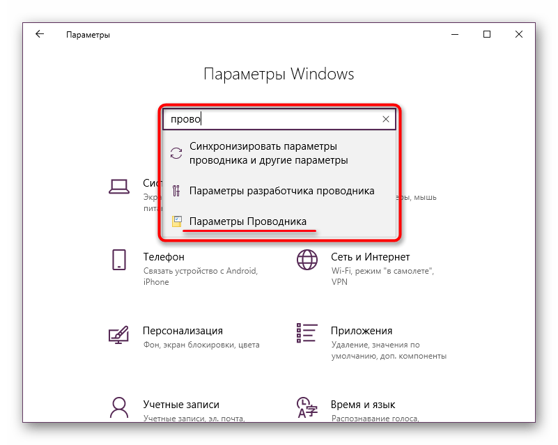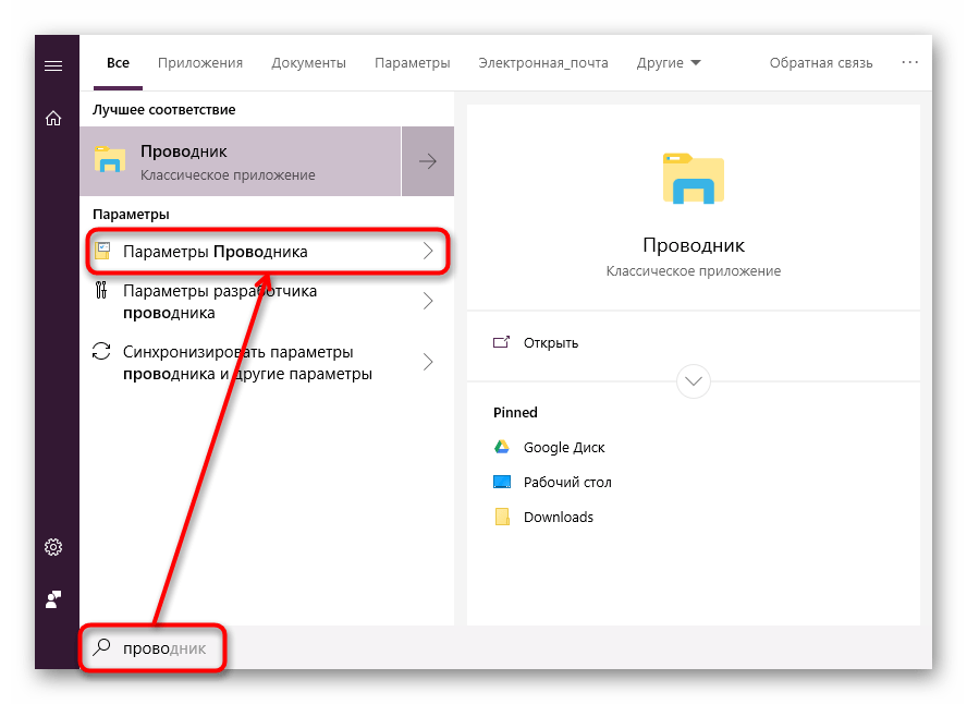 В поисковом поле начните набирать «проводник» и щелкните по найденному соответствию «Параметры Проводника».