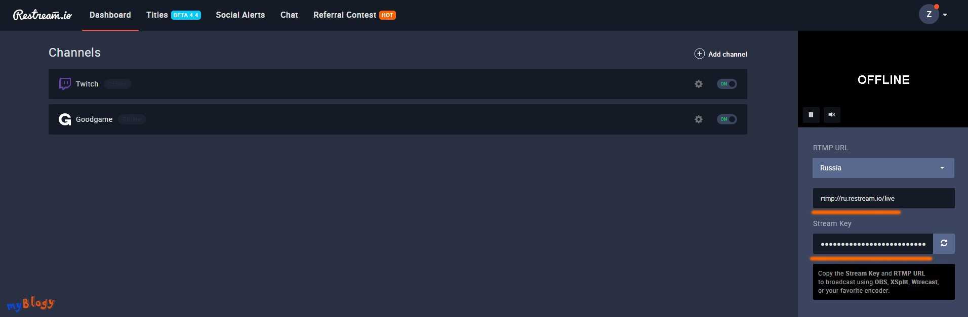 На «Твиче» ключ можно найти в «Панели управления» — «Канал» — «Ключ трансляции», на «Ютубе» — в «Творческой студии». После нажатия кнопки «Начать рестрим» на GoodGame прямые трансляции запустятся с задержкой в 10 секунд.