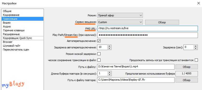 Ссылку на сервак скопируйте в поле “FMS URL“, ключ трансляции в поле “Stream Key“.