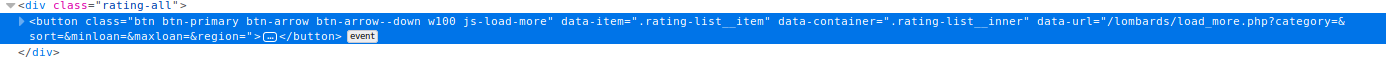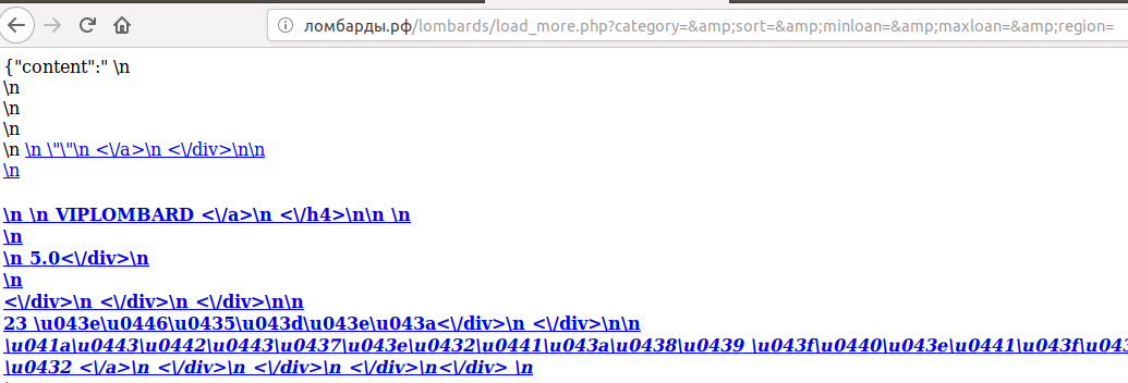 Если мы посмотрим код, то по этой кнопке дергается сервис (data-url=»/lombards/load_more.php?category=&sort=&minloan=&maxloan=&region=»). Если мы откроем в браузере эту ссылку, то увидим вот такую интересную штуку: