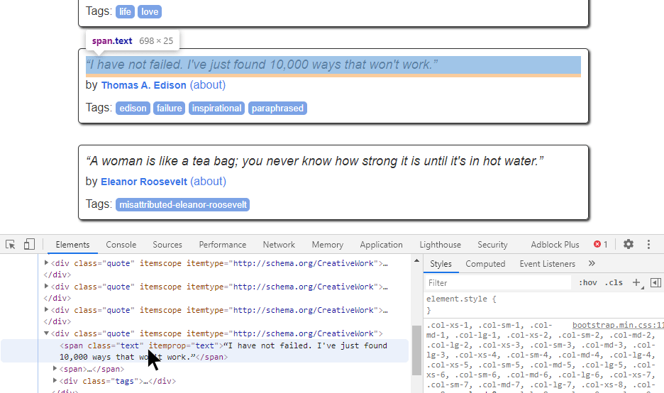 Если в браузере воспользоваться инструментом «Inspect» (CTRL+SHIFT+I), то можно достаточно просто увидеть, какая из частей разметки отвечает за тот или иной элемент страницы. Достаточно навести мышью на определенный тег , как он подсветит соответствующую информацию на странице. Можно увидеть, что каждая цитата относится к тегу с классом .