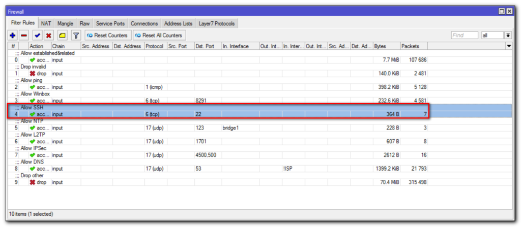 Чтобы настроить Mikrotik для удаленного подключения из интернета по протоколу SSH, нужно открыть 22 port. Делается это аналогичным способом, описанным выше. Поэтому мы просто скопируем ранее созданное правило, изменив порт: