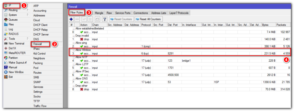 - IP => Firewall => Filter Rules;