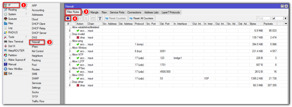 IP => Firewall => Filter Rules => “+”.