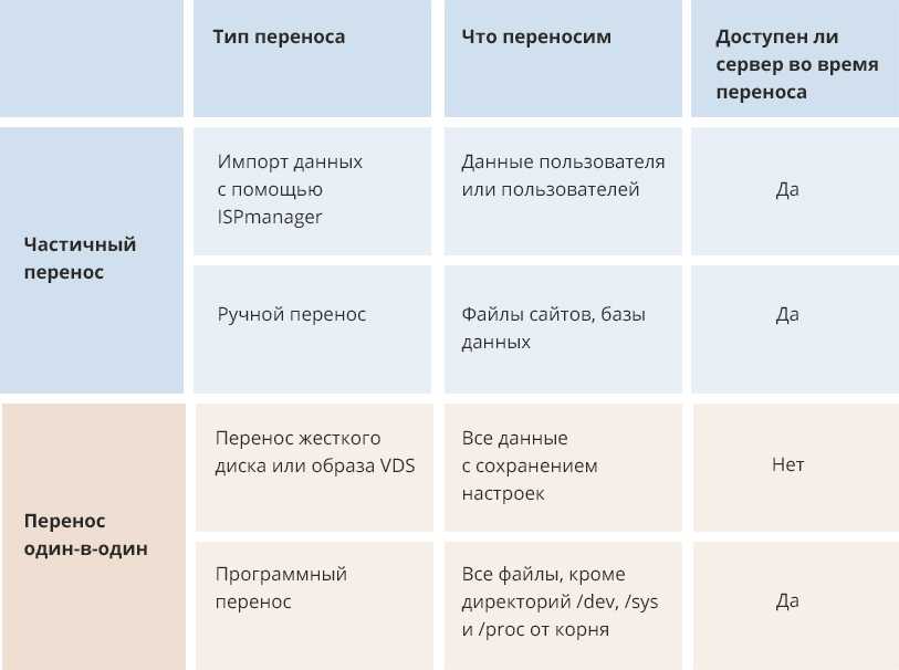 Название говорит само за себя — не получится в процессе данного переноса обновить операционную систему или распределить сайты по разным пользователям. Это перенос данных сервера один-в-один — взяли данные и в том виде, как они есть, перенесли на новый сервер. Поэтому вероятность того, что что-то не заработает, минимальна.
