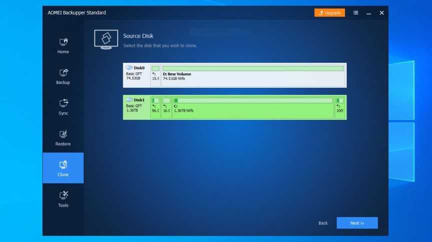 Запустите AOMEI Backupper и в левой боковой панели нажмите команду «Клонировать». Выберите «Клонировать диск». В качестве источника выберите C:, если такая метка у вашего жёсткого диска.