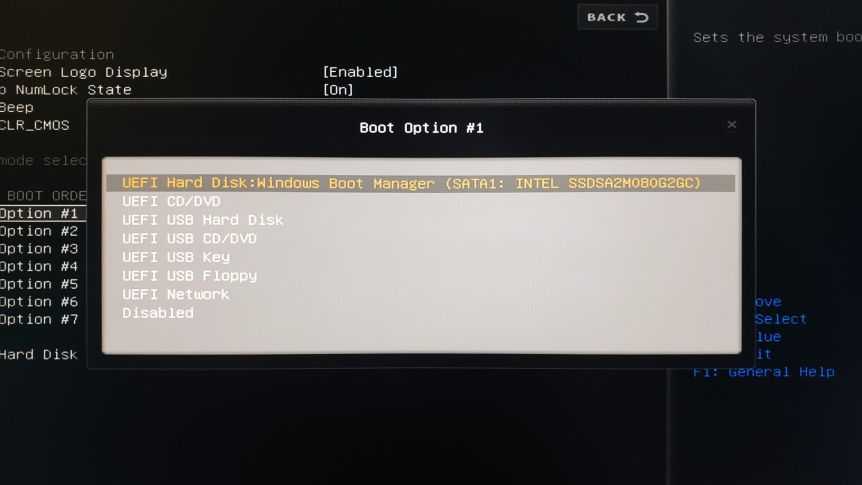 Дальше ищите варианты загрузки. На разных материнских платах они могут располагаться в разных местах и называться по-разному. Необходимо найти список, где отображается жёсткий диск и твердотельный накопитель. Они указаны в том порядке, в каком происходит загрузка. Нужно поставить SSD на первое место, выйти в основное меню BIOS и сохранить изменения.