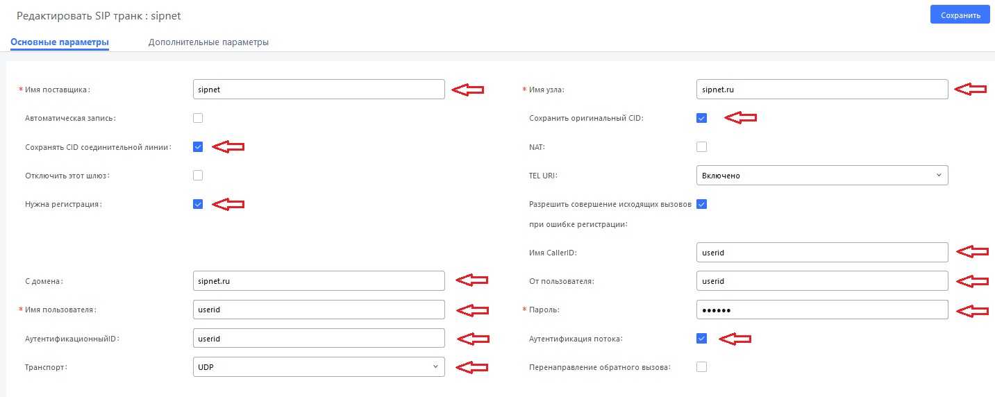 Чтобы настроить SIP-транк(-и), необходимо заполнить соответствующие поля. Информация для всех текстовых полей предоставляется вашим провайдером, который предоставляет услугу SIP-транка. В нашем случае для примера мы взяли провайдера SIPNET.