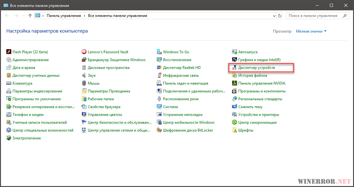 - В контекстном меню кнопки «Пуск» щёлкнуть раздел «Диспетчер устройств». О том как вызвать контекстное меню и настроить меню Пуск под себя читайте в статье “Меню Пуск в Windows 10” .