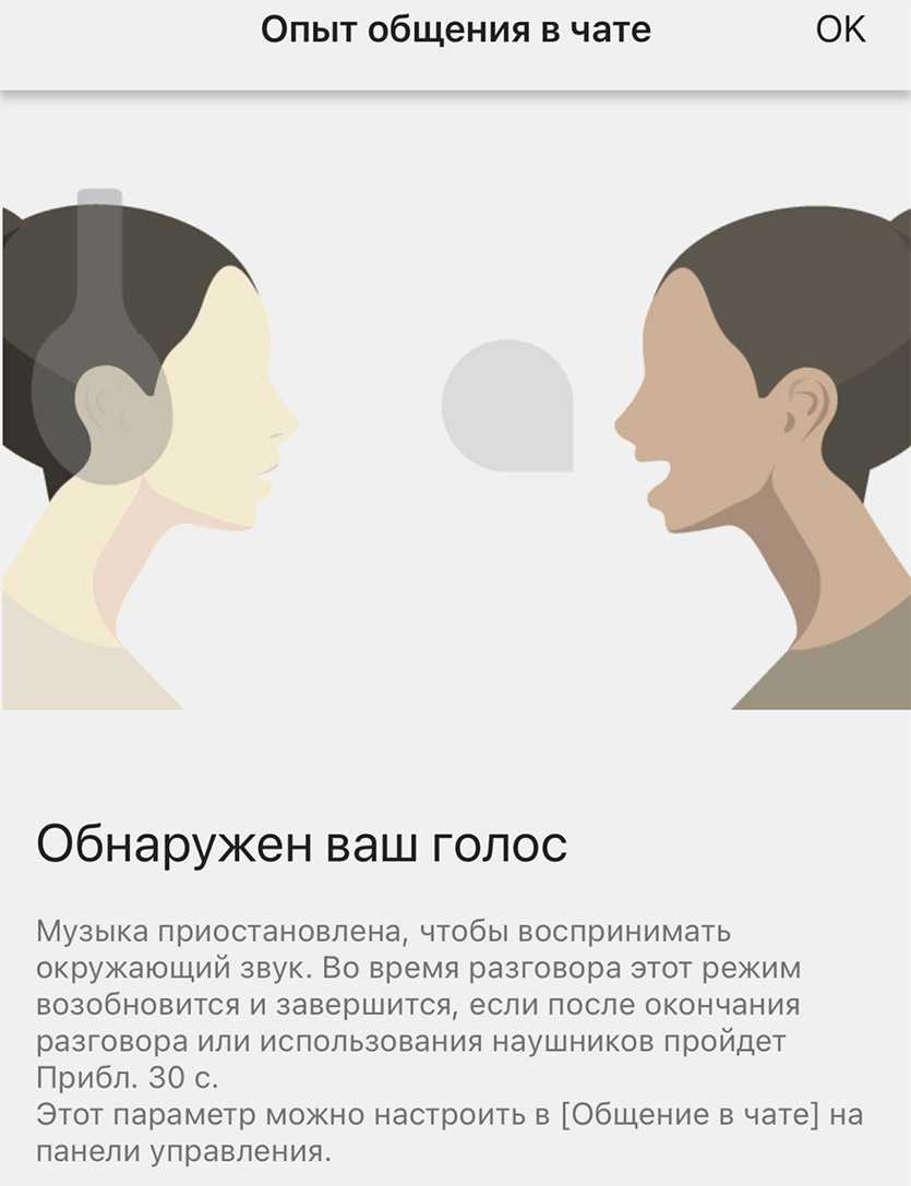 ► функция распознавания речи Speak-to-Chat. Наушники распознают, что вы начинаете говорить, и сами включают режим пропуска внешних шумов. Через 30 секунд после окончания разговора этот режим отключается автоматически.