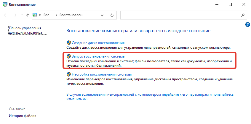 - Перейти по гиперссылке «Запуск восстановления системы».