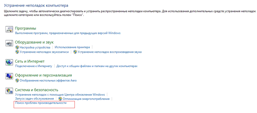 - В появившемся окне в пункте «Система и безопасность» жмем на «Поиск проблем производительности».