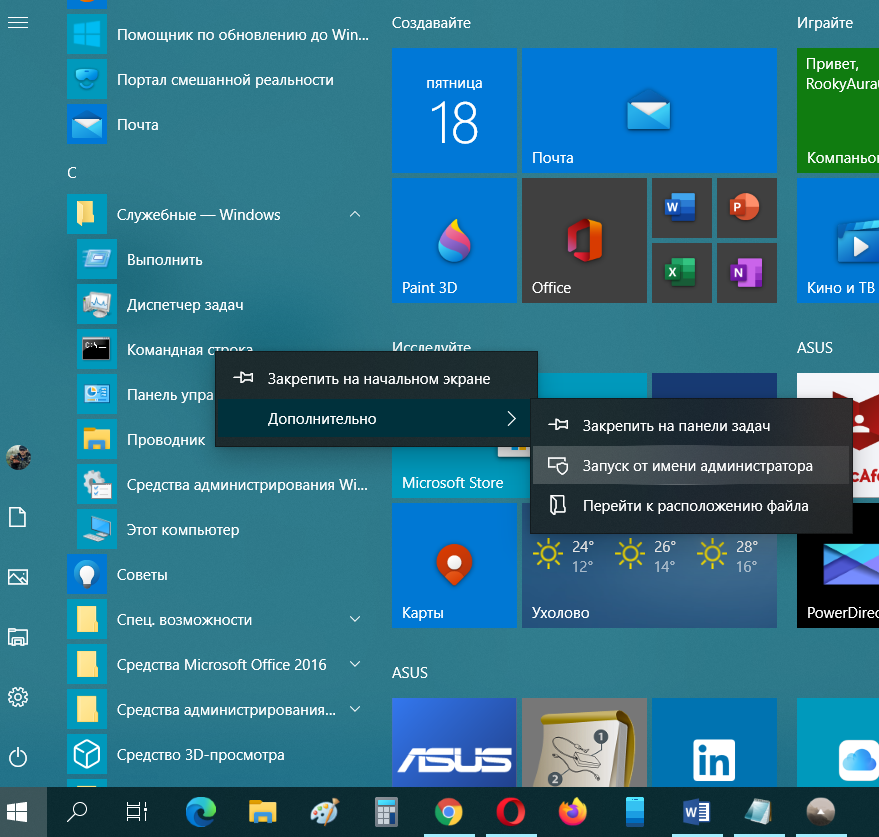 Теперь нужно подключить смартфон к компьютеру по USB, выбрать опцию: Пуск – Служебные. Далее нужно кликнуть правой кнопкой мышки по пункту Командная строка и выбрать опцию запуска от имени администратора.