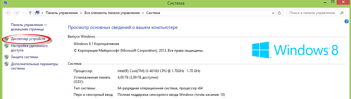 Откроется окно свойств в котором слева вверху можно выбрать пункт Диспетчер устройств.
