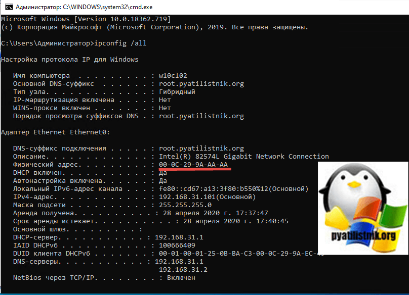 Каждый сетевой адаптер (Network Interface Card) имеет уникальный MAC-адрес (Media Access Control). Это относится ко всем типам сетевых карт, включая карты Ethernet и WiFi. MAC-адрес (Физический адрес) представляет собой шестибайтовое число или 12-значное шестнадцатеричное число, которое используется для уникальной идентификации хоста в сети. Для примера я вам покажу свой тестовый сервер с Windows 10. Самый быстрый метод его узнать, это выполнить в командной строке команду ipconfig /all. У меня физический адрес (MAC-адрес) имеет значение «00-0C-29-9A-EC-49».