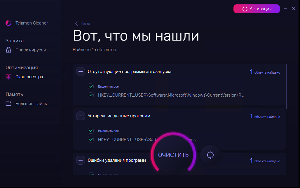 После работы с реестром желательно почистить кэш. Telamon самостоятельно найдет файлы в КЭШе и удалит их.