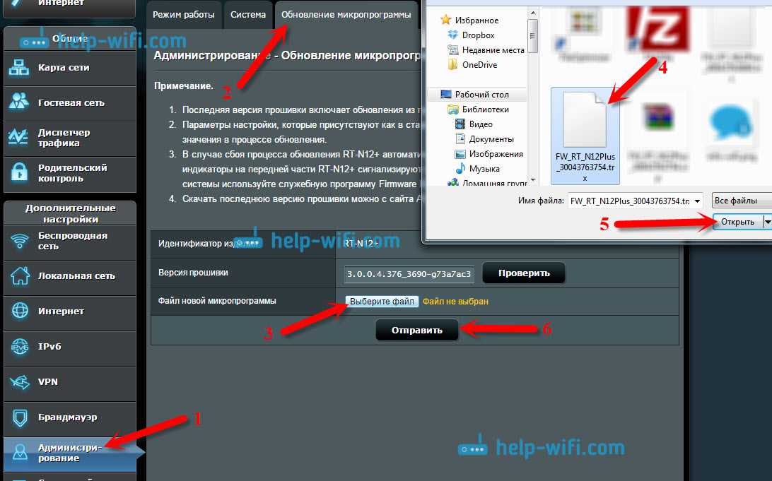 В настройках роутера перейдите на вкладку Администрирование — Обновление микропрограммы. Нажмите на кнопку Выберите файл, и выберите файл прошивки на компьютере. Для запуска обновления, нажмите на кнопку Отправить.