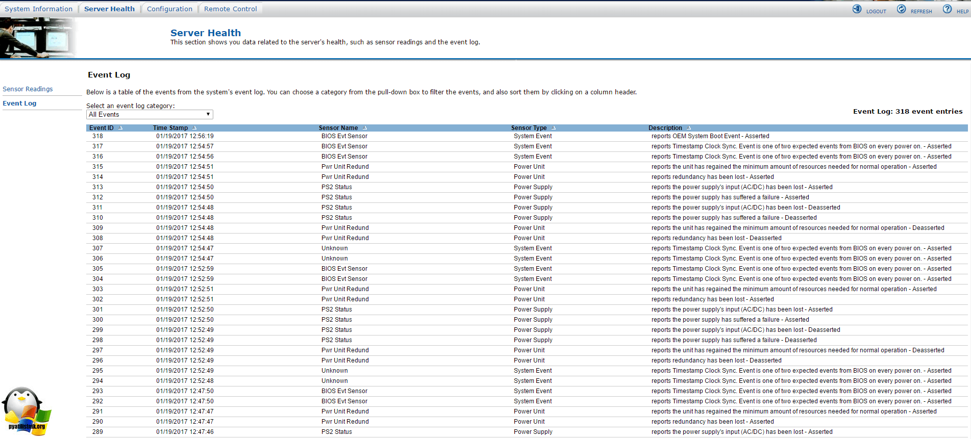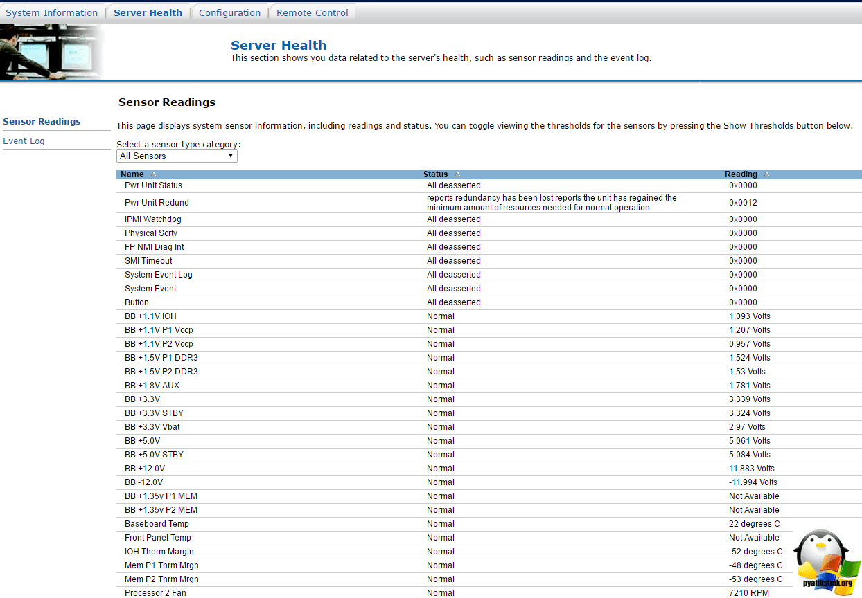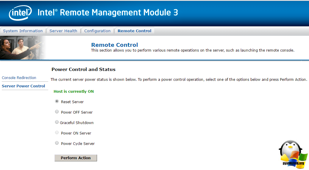 Ну и естественно удаленное управление включением и выключением сервера, BMC у intel S5520UR умеет все это делать, через пункт Server Power Control.