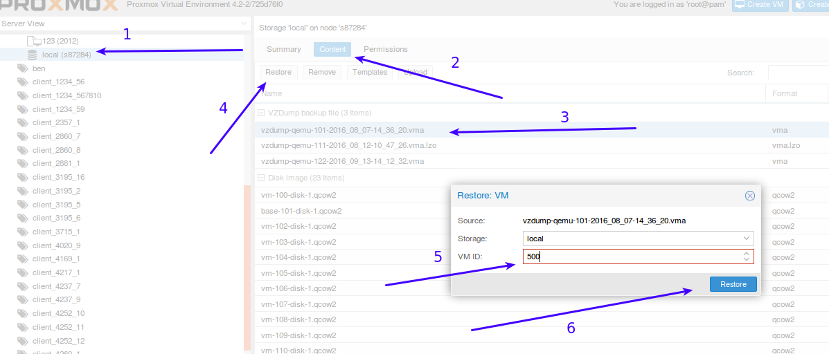 qmrestore is the command to restore VM, next is the virtual machine name “vzdump-qemu-122-2016_09_13-14_12_32.vma” and the last argument is the VM id (500), you can choose any VM ID that is not being used earlier.