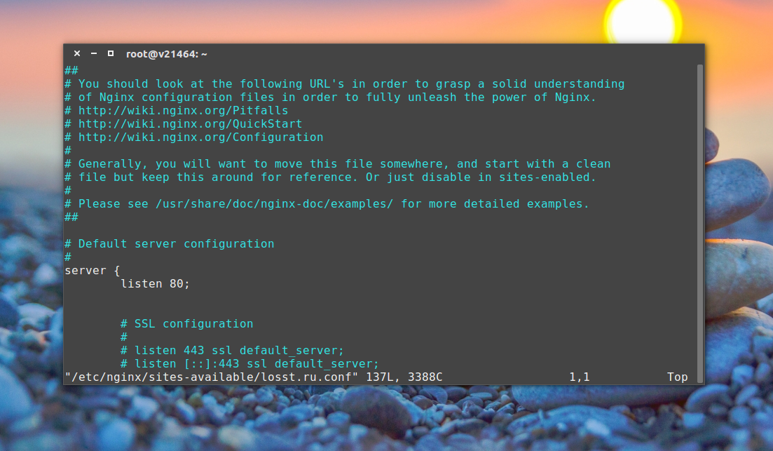 - listen 80 — указывает, что нужно ожидать подключения на порту 80, может также содержать опцию default-server, которая означает, что этот домен будет открывается если домен не был задан в запросе.