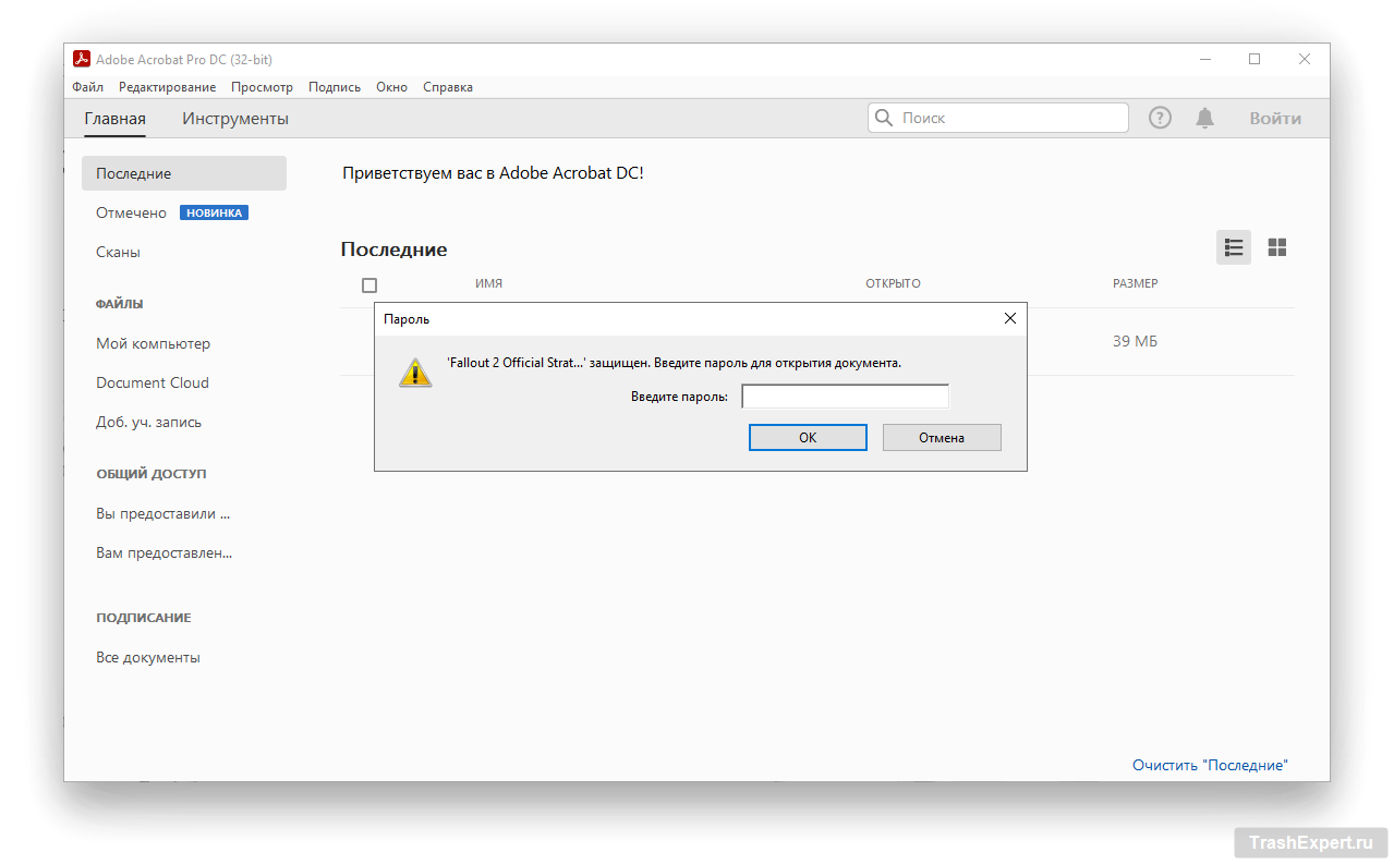 Отныне при открытии файла в Adobe Reader, Adobe Acrobat или другом PDF-ридере должен появиться запрос на ввод пароля для получения доступа. Введите пароль, нажмите ОК и содержимое документа станет доступным.