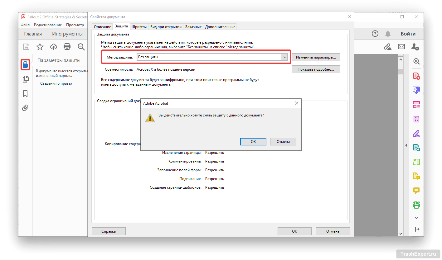 Для удаления пароля откройте файл в Acrobat и введите пароль. Нажмите на иконку замка слева и на «Сведения о правах» в разделе «Параметры защиты». На вкладке «Защита» в свойствах документа нажмите на раскрывающееся меню «Метод защиты» и измените значение параметра на «Без защиты». Acrobat уточнит, что точно ли вы хотите снять защиту. Нажмите ОК, а затем повторно сохраните файл.